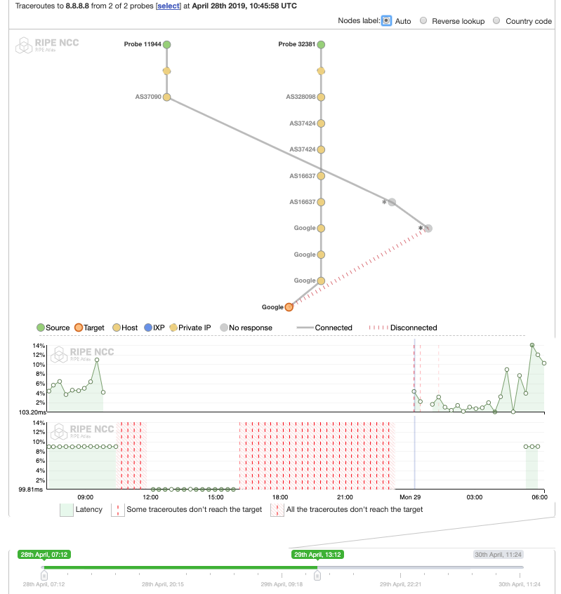 **Figure 11:**RIPE Atlas measurement, Recurring IPv4 traceroute measurement from all probes online in Benin to Google DNS (8.8.8.8), https://atlas.ripe.net/measurements/21083844/ (AS paths inferences during the shutdown), April 28, 2019