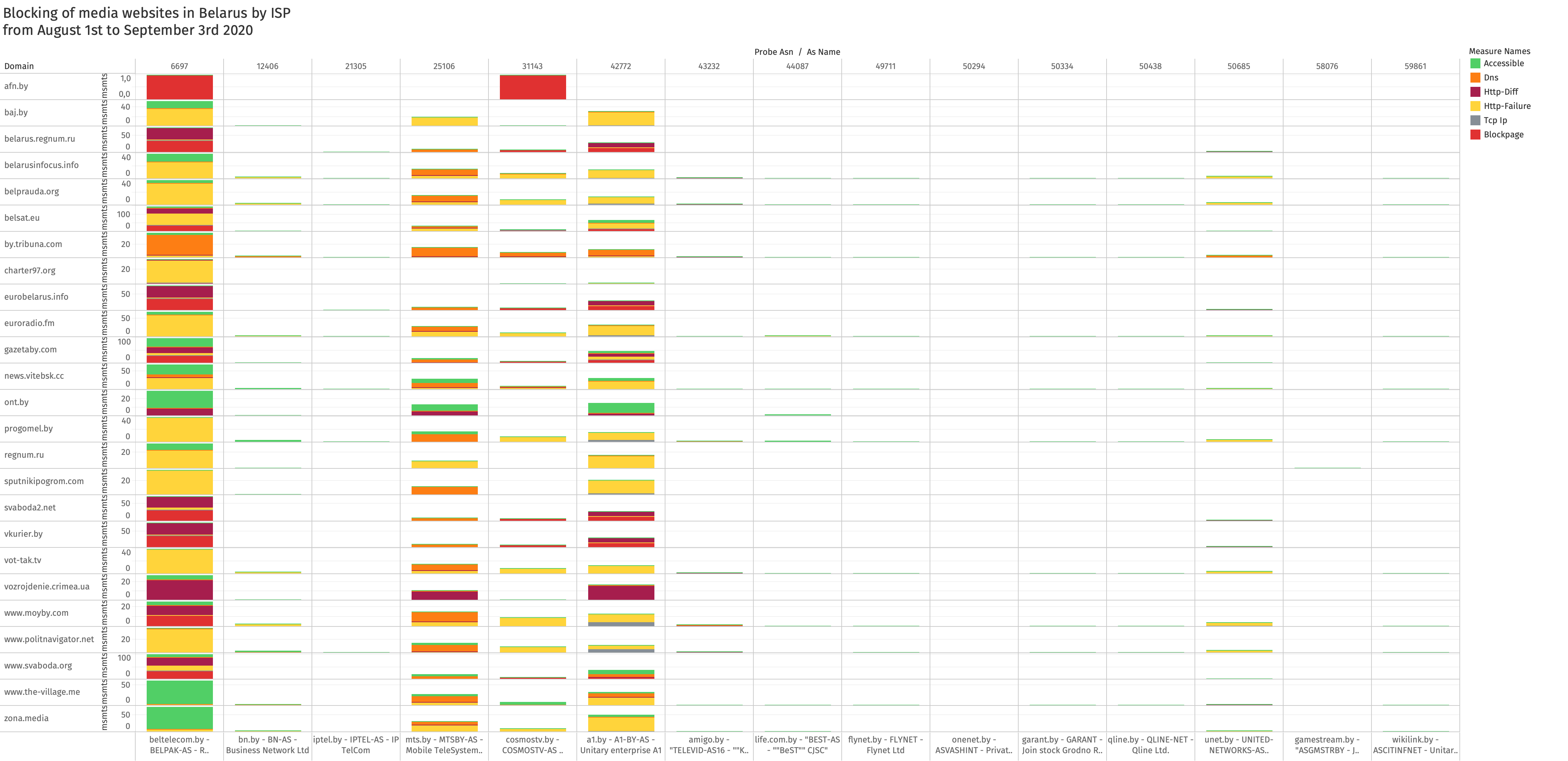 These findings are limited to our analysis of OONI measurements collected from multiple ISP networks in Belarus between 1st August 2020 to 3rd September 2020, and exclude websites which received limited testing coverage during this period.