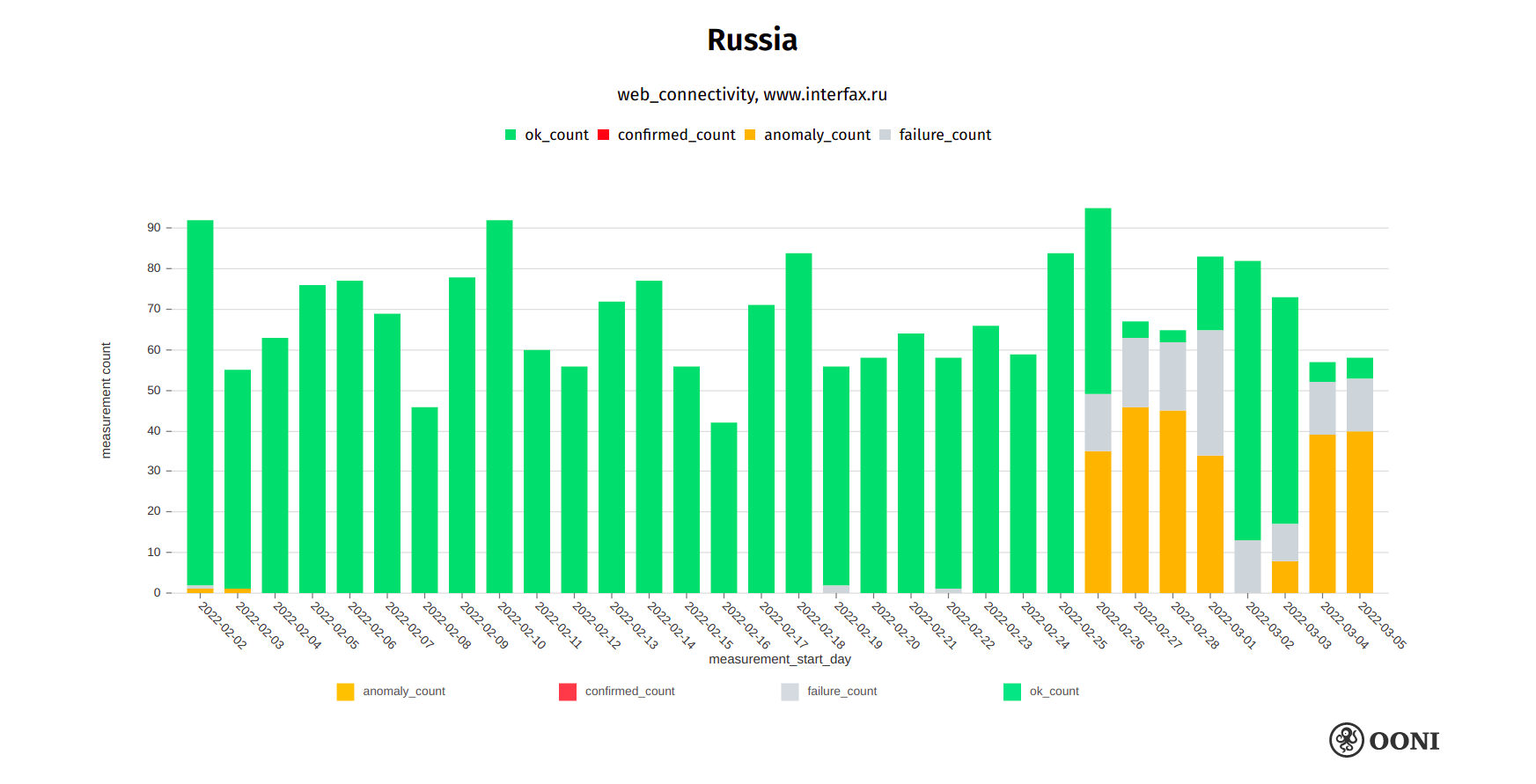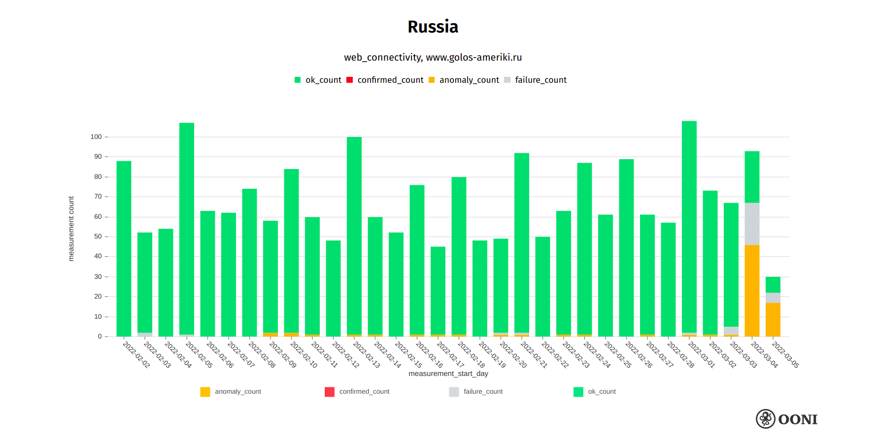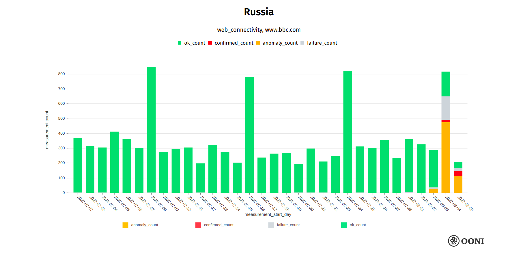 Chart: OONI data on the testing of bbc.com in Russia, https://explorer.ooni.org/search?since=2022-02-03&until=2022-03-06&failure=false&domain=www.bbc.com&probe_cc=RU