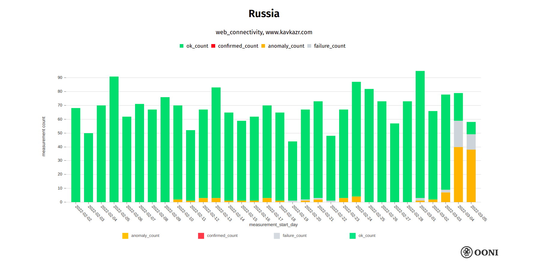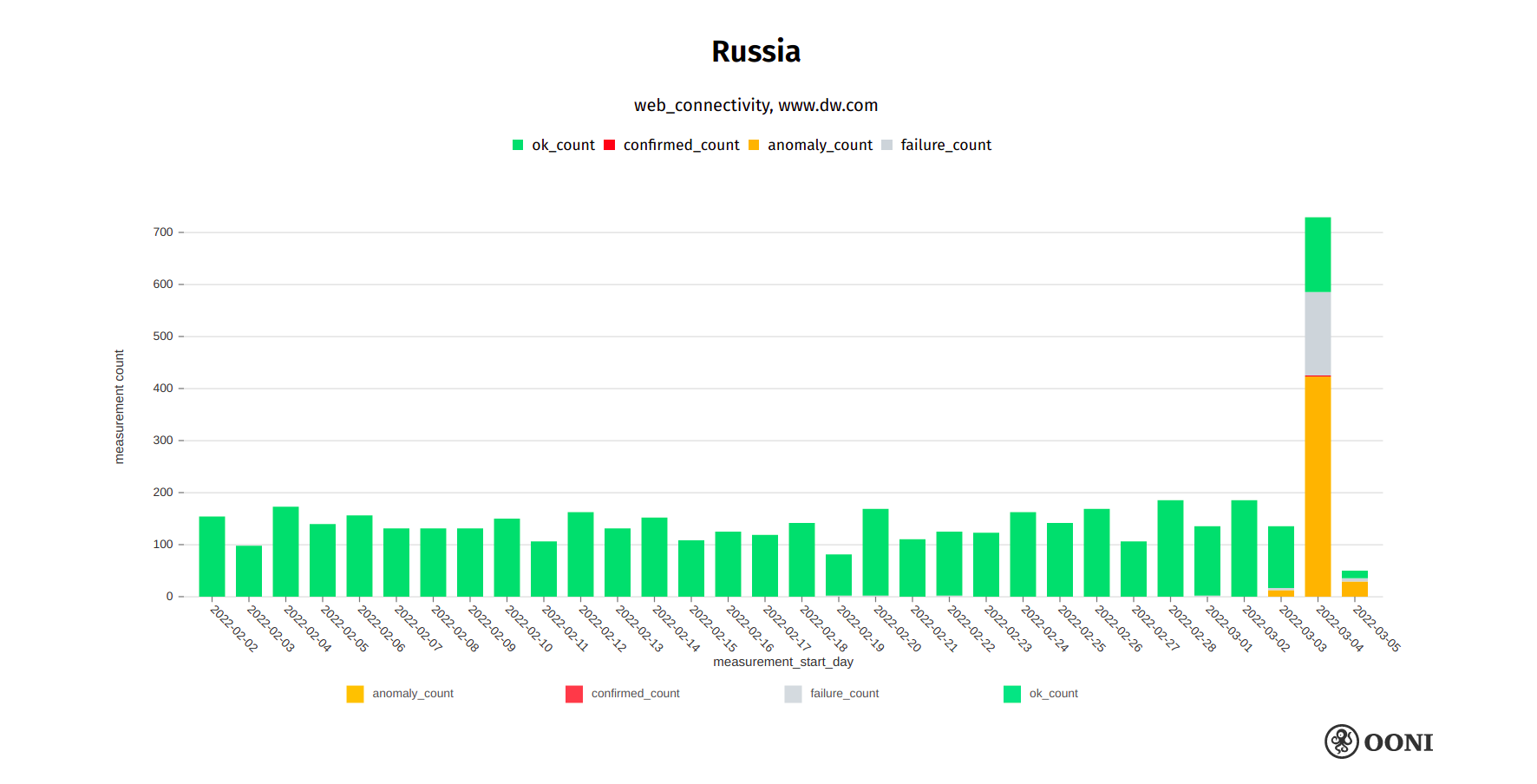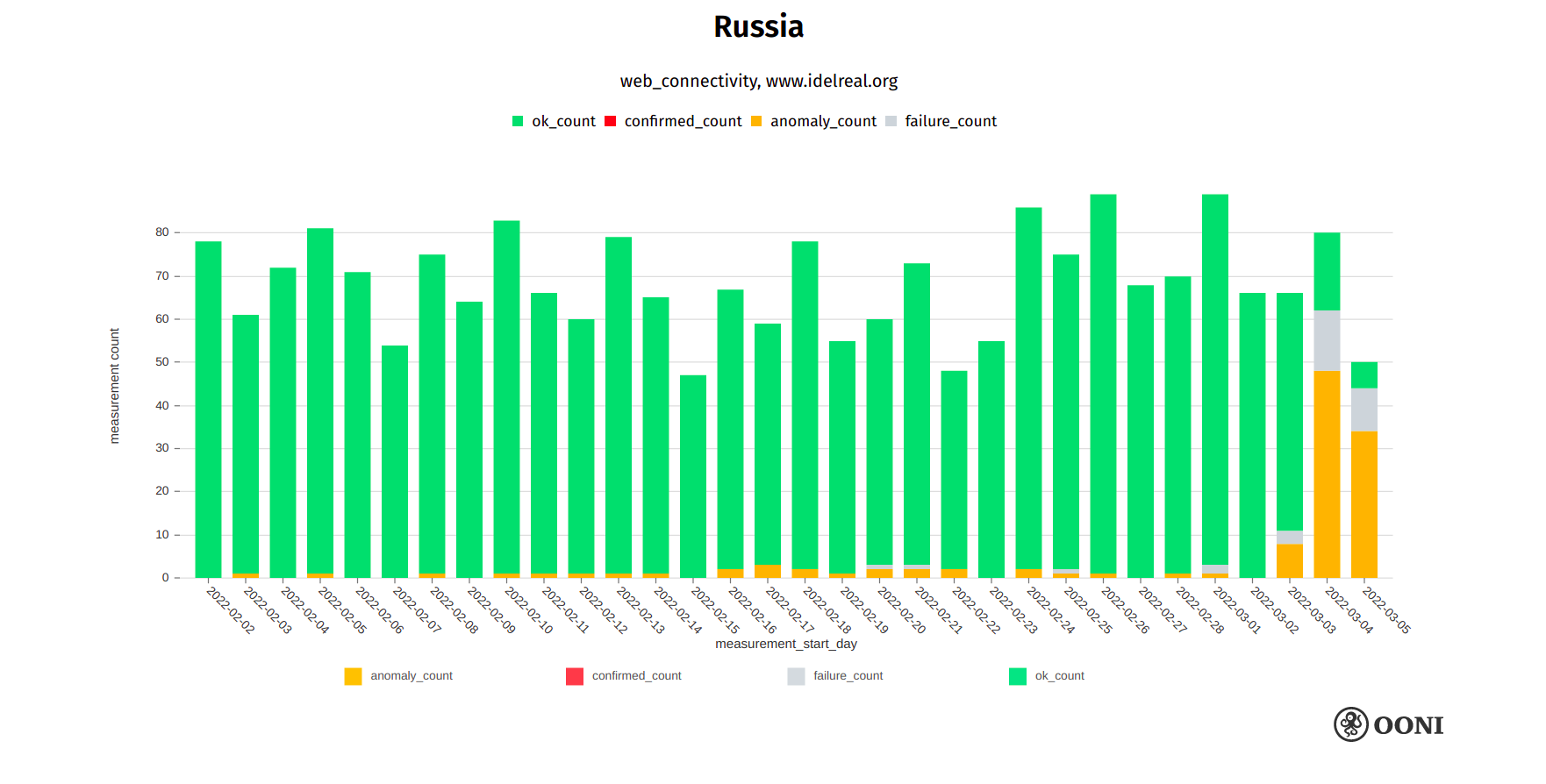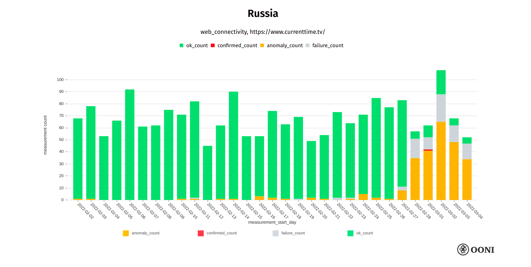 Chart: OONI data on the testing of bbc.com in Russia, https://explorer.ooni.org/search?since=2022-02-03&until=2022-03-06&failure=false&domain=www.bbc.com&probe_cc=RU
