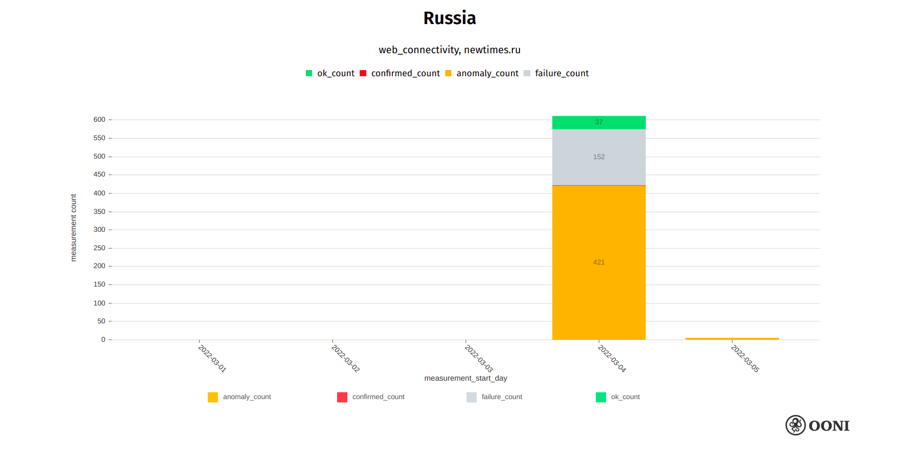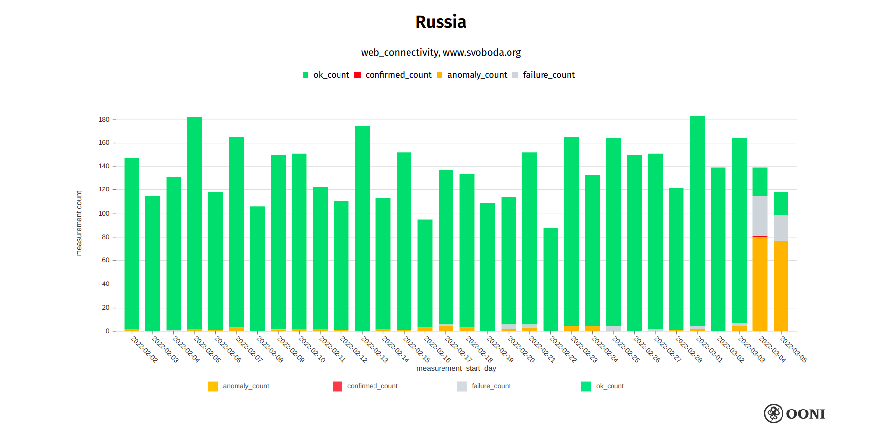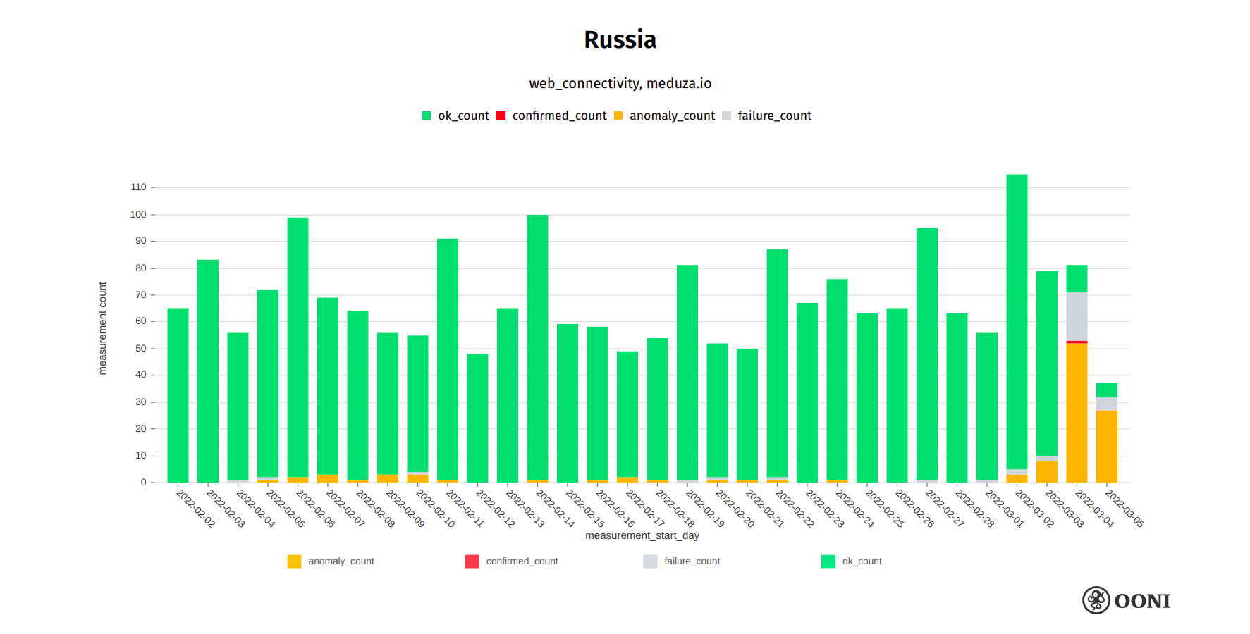 We are able to observe the blocking of media websites in Russia through OONI data, as illustrated in the chart below.