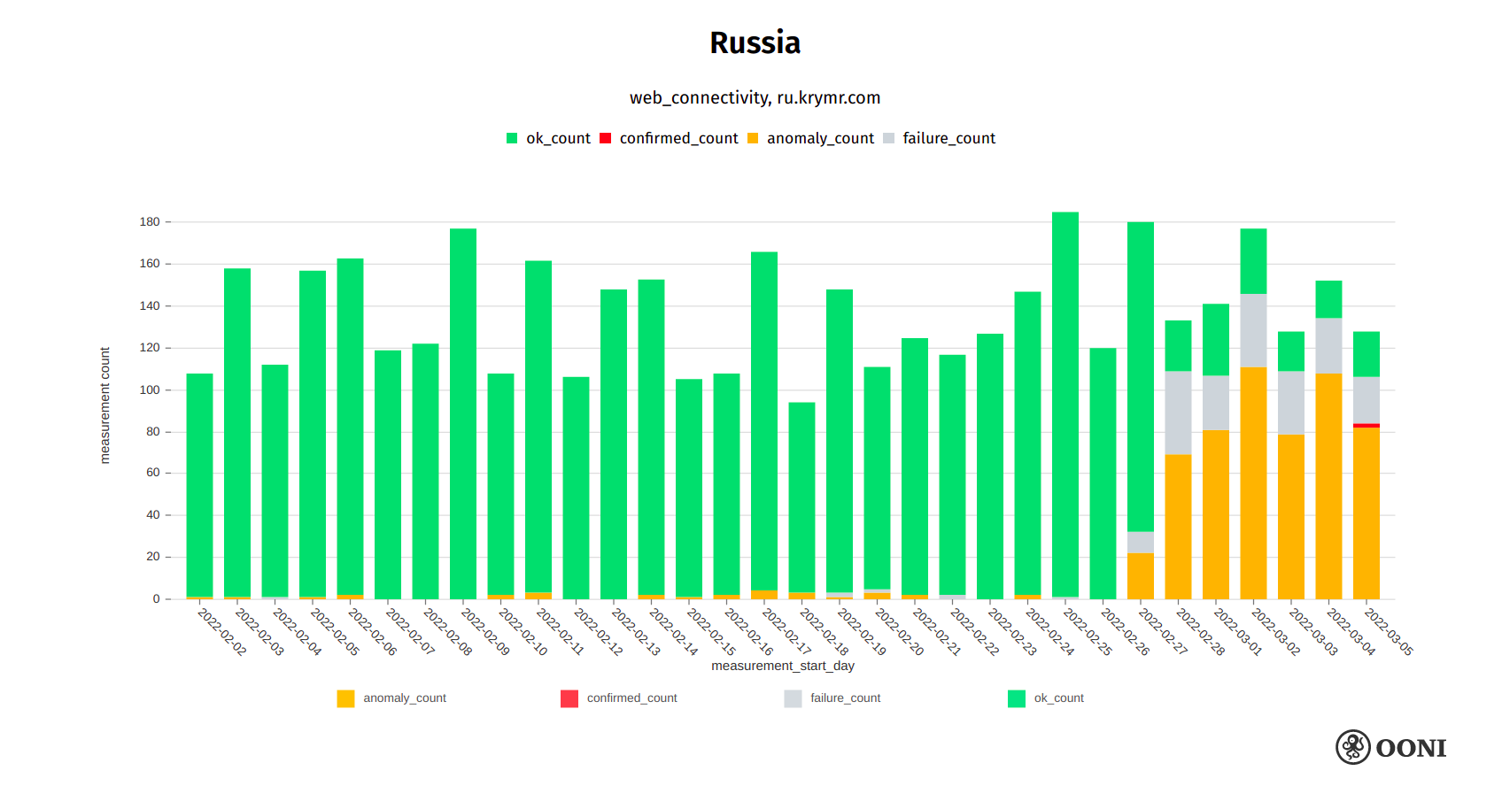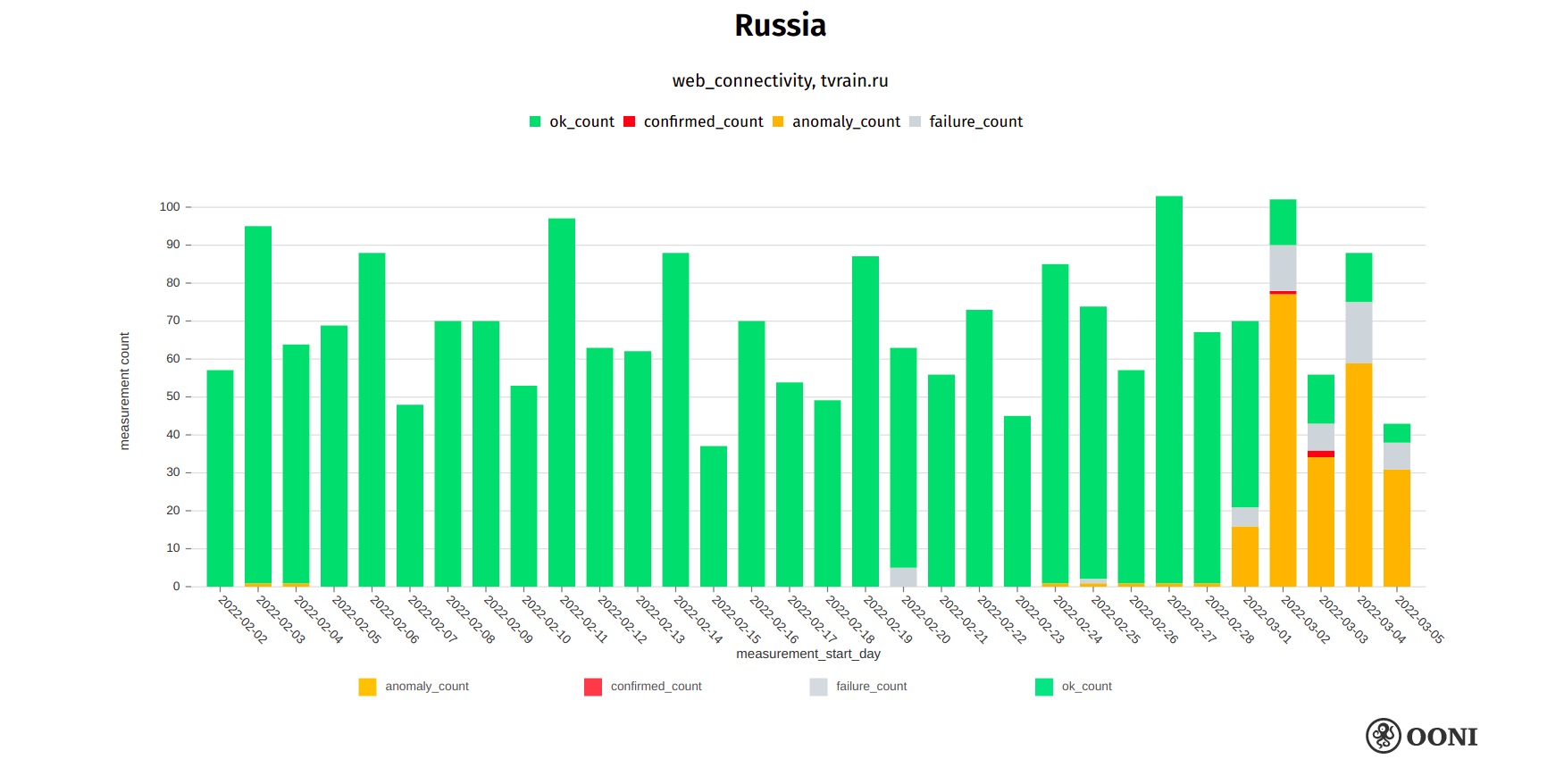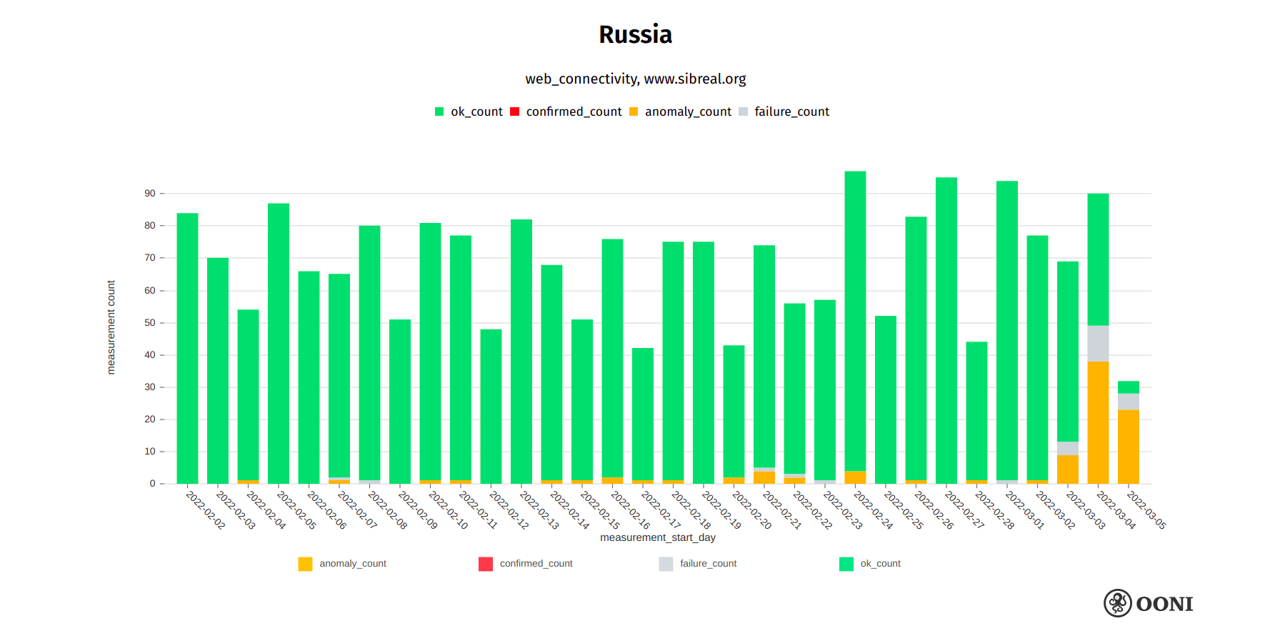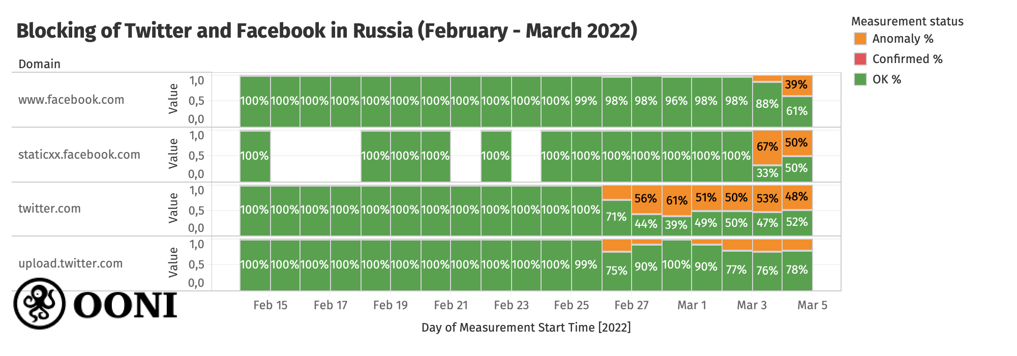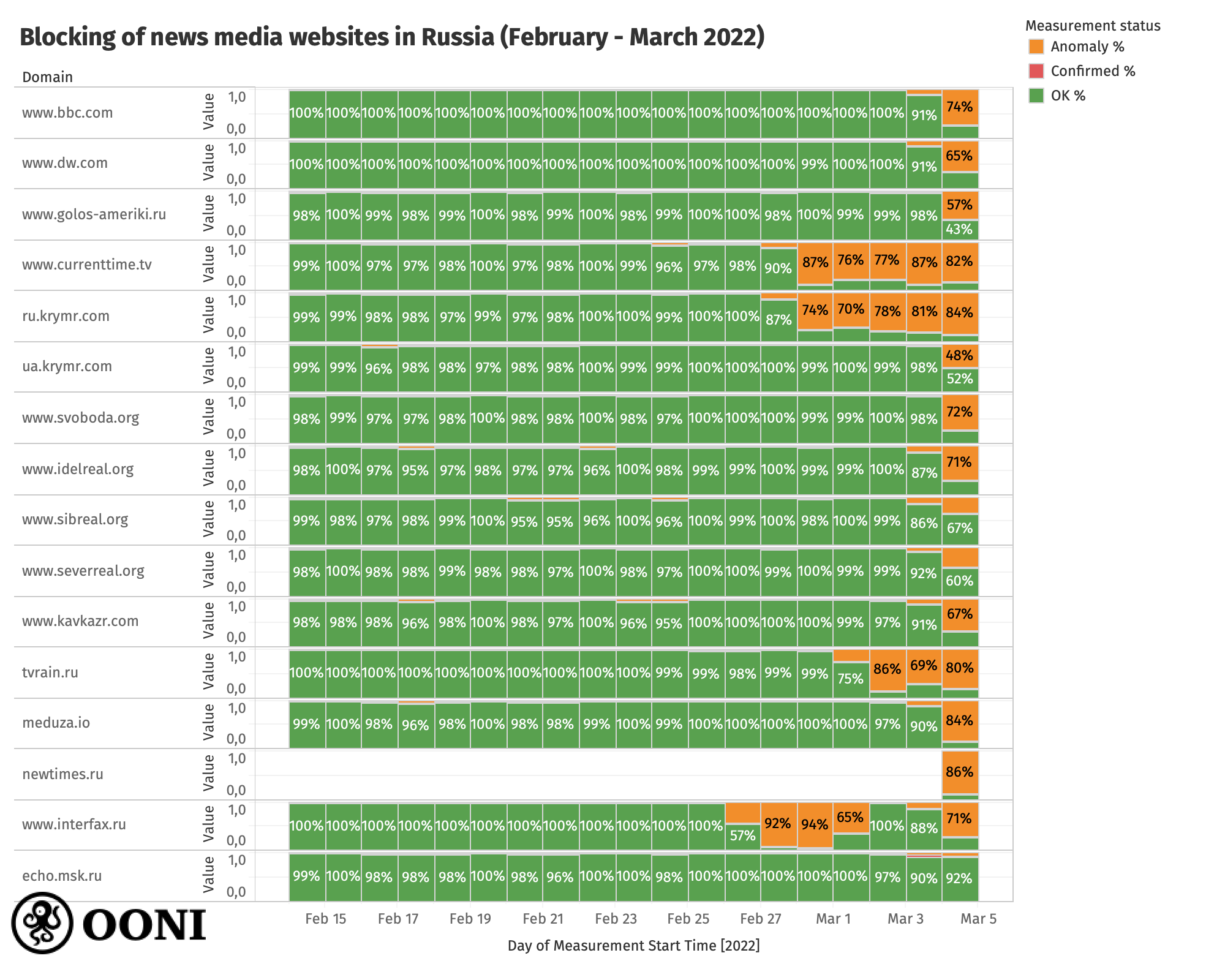 The above chart aggregates OONI measurements collected from Russia (between February 2022 to March 2022) pertaining to the testing of news media websites that started presenting anomalies following the invasion of Ukraine (which started on 24th February 2022). Each bar for a given domain and day represents the percentage of measurements for a given status (anomaly, confirmed or OK) aggregated across all networks.