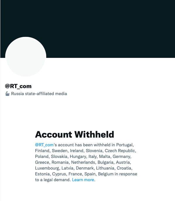 Similar geoblocks have been implemented by Twitter. When attempting to access RT_com from an EU country, the following page is displayed: