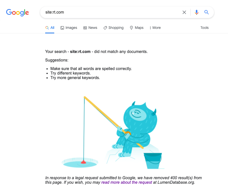 On 4th March 2022, the European Commission requested Google to remove results from Google Search that pertain to rt.com and sputniknews.com. The following screenshot is taken from our web browser in Italy (when searching for rt.com).