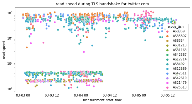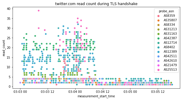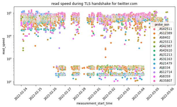 Through the above chart we can see that there was a change in the blocking pattern for twitter.com between 26th February 2022 to 4th March 2022. In particular, we can see that between these dates, the read_speed metric (for many samples) during the TLS handshake for twitter.com is very slow (suggesting Twitter throttling), while from 4th March 2022 onwards, we observe that the read_speed metric resumes to previous levels. However, OONI data from 4th March 2022 onwards shows connection resets, suggesting that interference to twitter.com changed from throttling to blocking (through the injection of a RST packet).