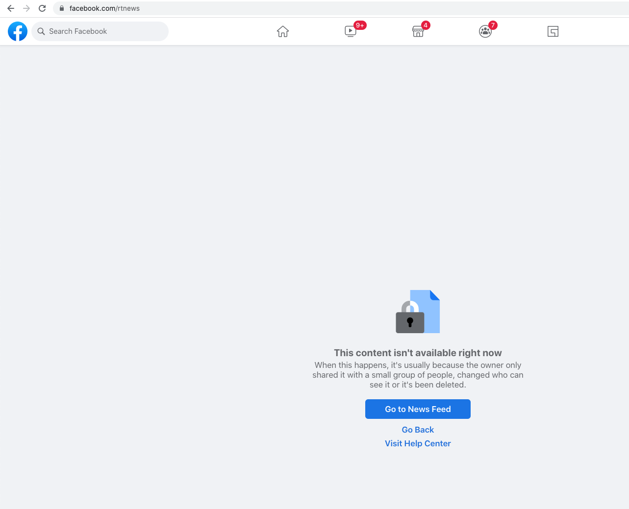 When Facebook users in Europe attempt to access the RTNews page while logged in, the following page is presented:
