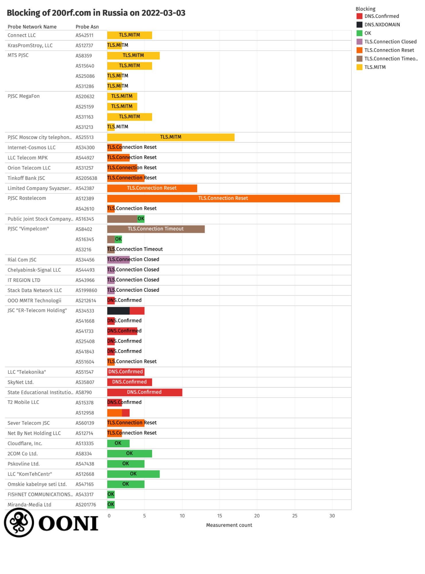 In recent days, OONI network measurement data collected from Russia shows that many Internet Service Providers (ISPs) have started blocking access to several news media websites, as well as to a website (200rf.com) that shares information about captured and killed Russian soldiers in Ukraine. OONI data also shows that Russian ISPs started throttling access to Twitter on 26th February 2022, and switched to blocking it by 4th March 2022 – at which point, they also started blocking access to Facebook. Censorship in Russia is generally implemented in a decentralized way, as blocks are not observed on all networks, while ISPs adopt a variety of different censorship techniques.