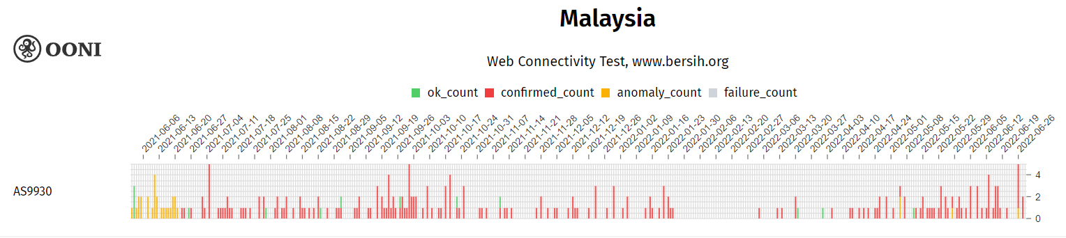 35. Open Observatory Network Interference. OONI Measurement Aggregation Toolkit (MAT) showing measurement collected from Malaysia on the testing of web connectivity from January 1st, 2022 to June 30, 2022. https://explorer.ooni.org/chart/mat?probe_cc=MY&test_name=web_connectivity&since=2022-01-01&until=2022-06-30&axis_x=measurement_start_day&axis_y=domain ↩︎