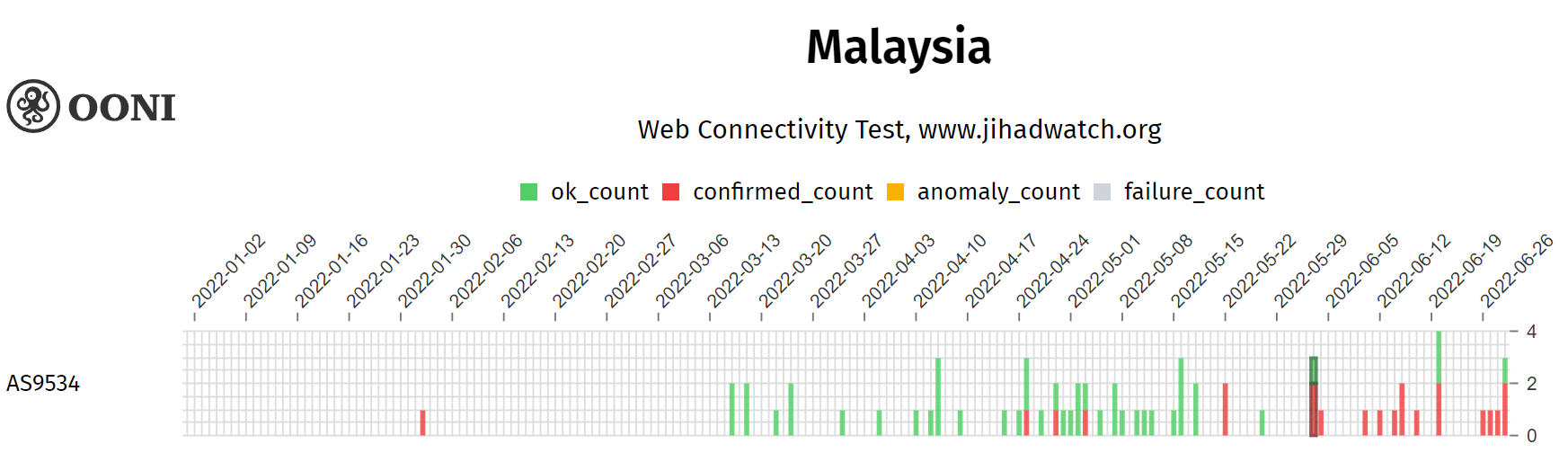 www.thereligionofpeace.comReligionAS4788, AS9930, AS4818, AS9534, AS10030https://explorer.ooni.org/chart/mat?probe_cc=MY&test_name=web_connectivity&domain=www.thereligionofpeace.com&since=2022-01-01&until=2022-06-30&axis_x=measurement_start_day&axis_y=probe_asn