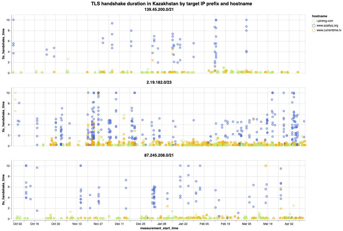 Chart: TLS handshake duration in Kazakhstan by target IP prefix and hostname.