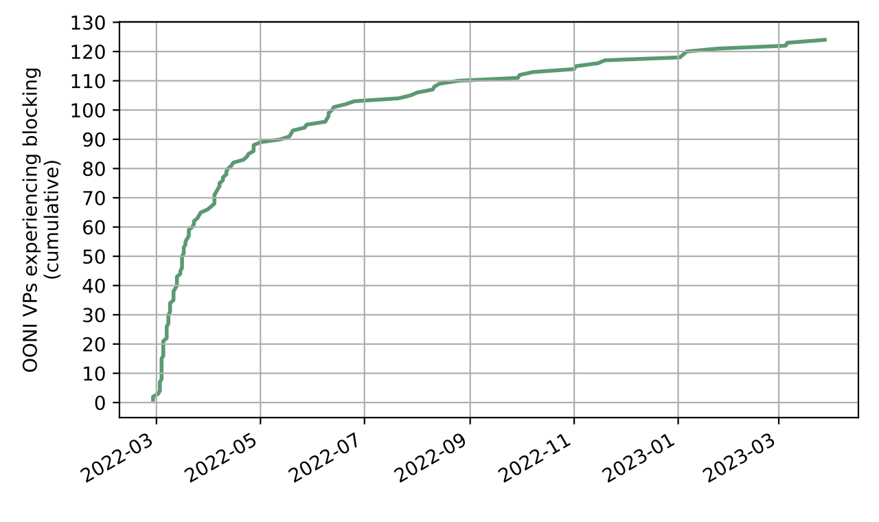 Figure 1: VPs showing first signs of blocking of www.rt.com over the course of 13 months, as measured by OONI.