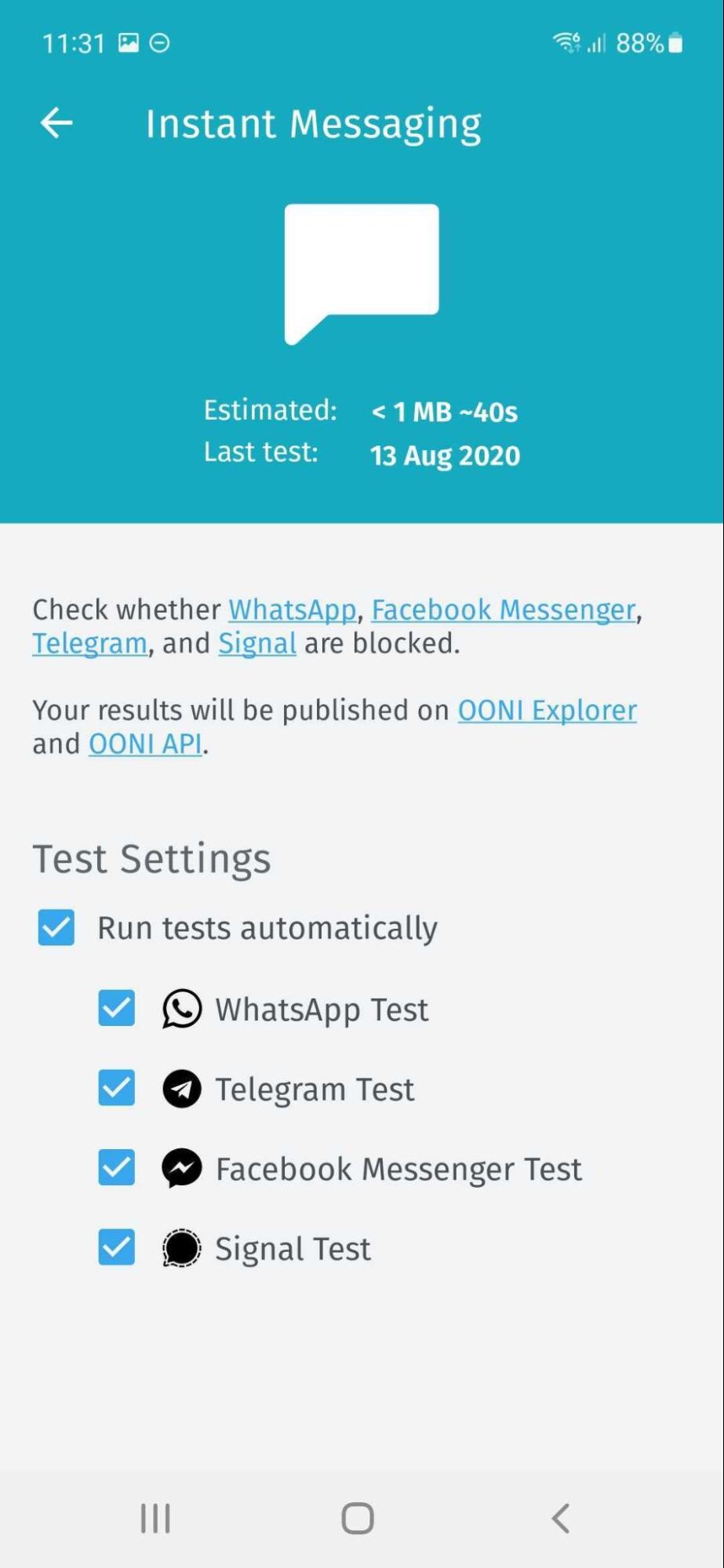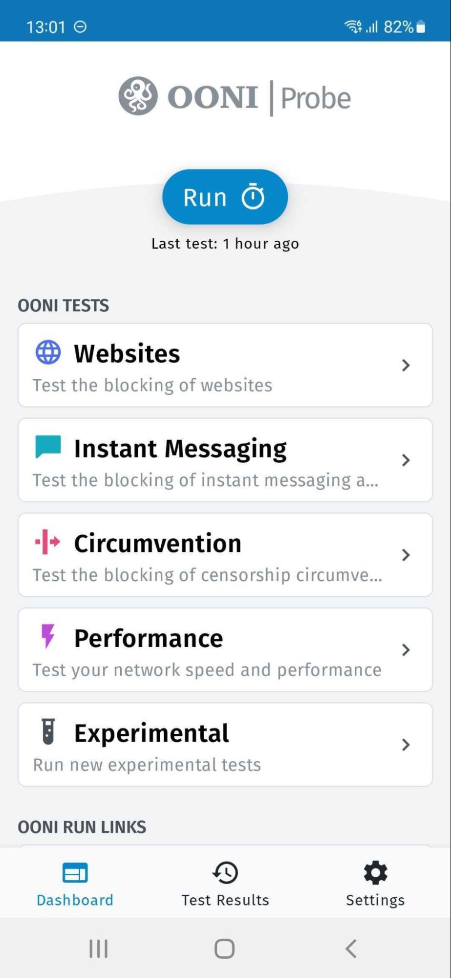 - Automated testing of OONI Run link websites. By keeping the “Run tests automatically” option enabled, the websites included in the OONI Run link will get tested automatically on an ongoing basis. That way, you don’t need to remember to re-test those websites once you have installed the OONI Run link – the OONI Probe app will do that automatically for you! We recommend keeping this option enabled to help ensure ongoing testing, greater measurement coverage, and enhanced ability to confirm potential blocks.