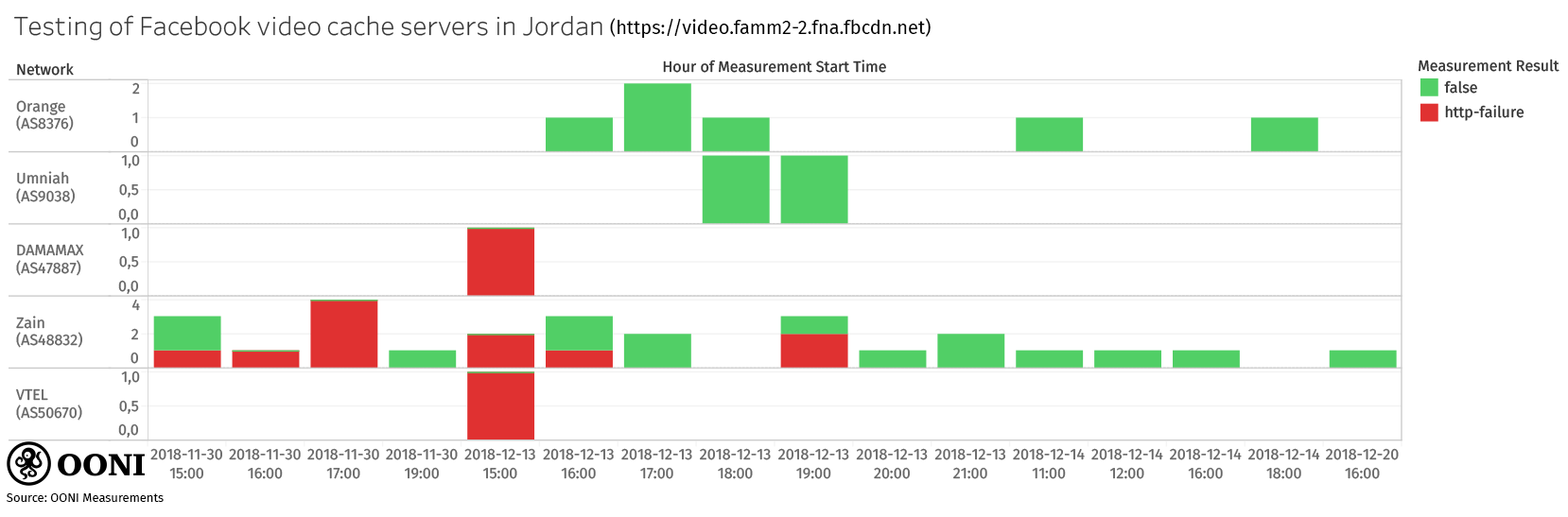 More specifically, we ran OONI Probe’s Web Connectivity test to measure the potential DNS, TCP/IP, or HTTP blocking of Facebook video cache servers. These tests were run from local vantage points in Jordan on Zain Jordan (AS48832), Umniah (Batelco Jordan) (AS9038), DAMAMAX (Al-Hadatheh Lil-Itisalat) (AS47887), VTEL (AS50670), and Orange (Jordan Data Communications) (AS8376) between 30th November 2018 to 20th December 2018. All measurements collected from these tests have been openly published.