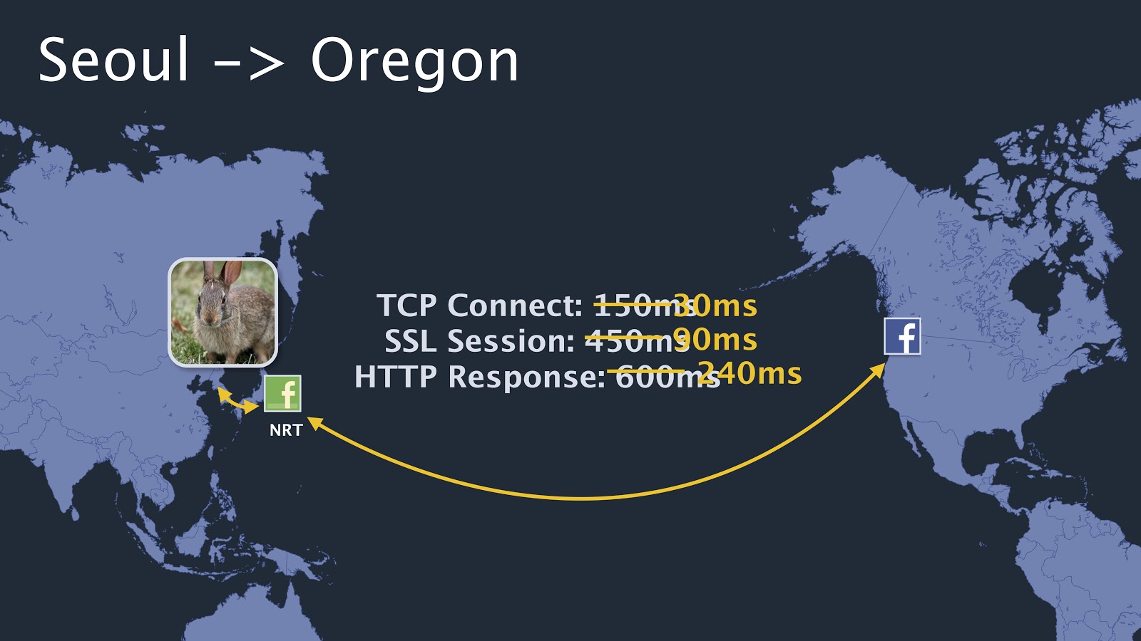 In this example, you can see that accessing a rabbit’s picture from the Seoul cache takes 240 milliseconds, while it would have taken 600 milliseconds to fetch it from Oregon.